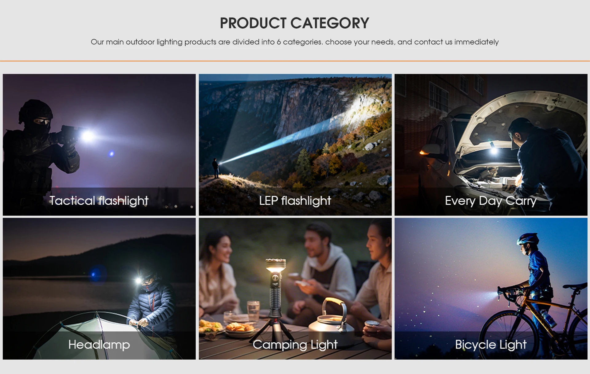 Main categories: LED Flashlight, LED Bicycle Light, Rechargeable Lithium Ion Battery, Chargers & Adapters, Bicycle Accessories